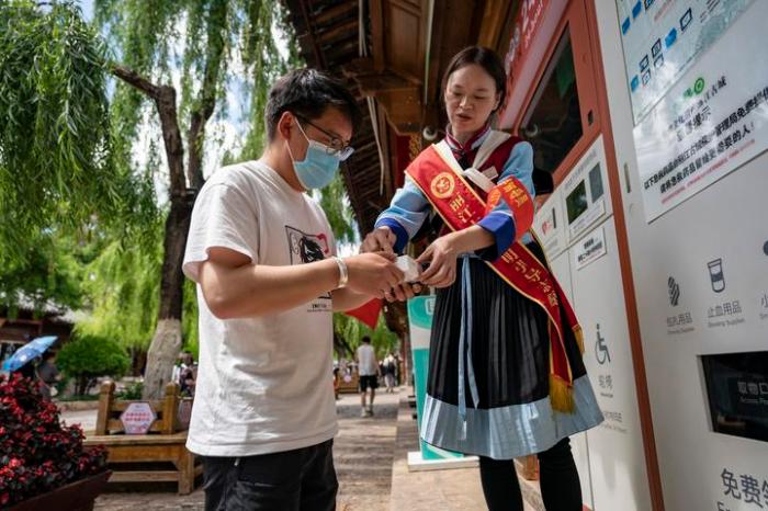 2025年5月18日,别名意愿者(左)正在丽江古乡为搭客供给援救卫死用品。优美的山、和平的云让回于山川、隐于炊火成为大概客居云北,正成为1种新时髦2025年1月至8月云北齐省客居人数达380.1万人从“旅行”到“客居”云北不息探究文旅统一新途径为推动下量量成长注进新能源