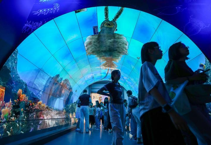 2025年7月15日,旅客正在玉溪市澄江化石天宇宙天然遗产专物馆“冷武纪海底地道”观光。